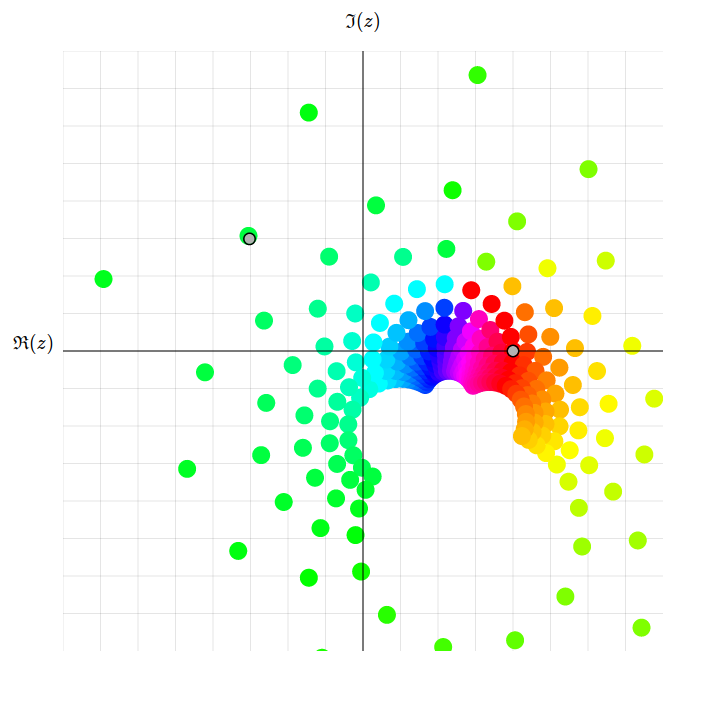 On the left, the visualisation uses domain coloring, and on the right, it uses discrete points \(a+b\mathrm{i}\) with \(a,b \in \mathbb{Z}\).
